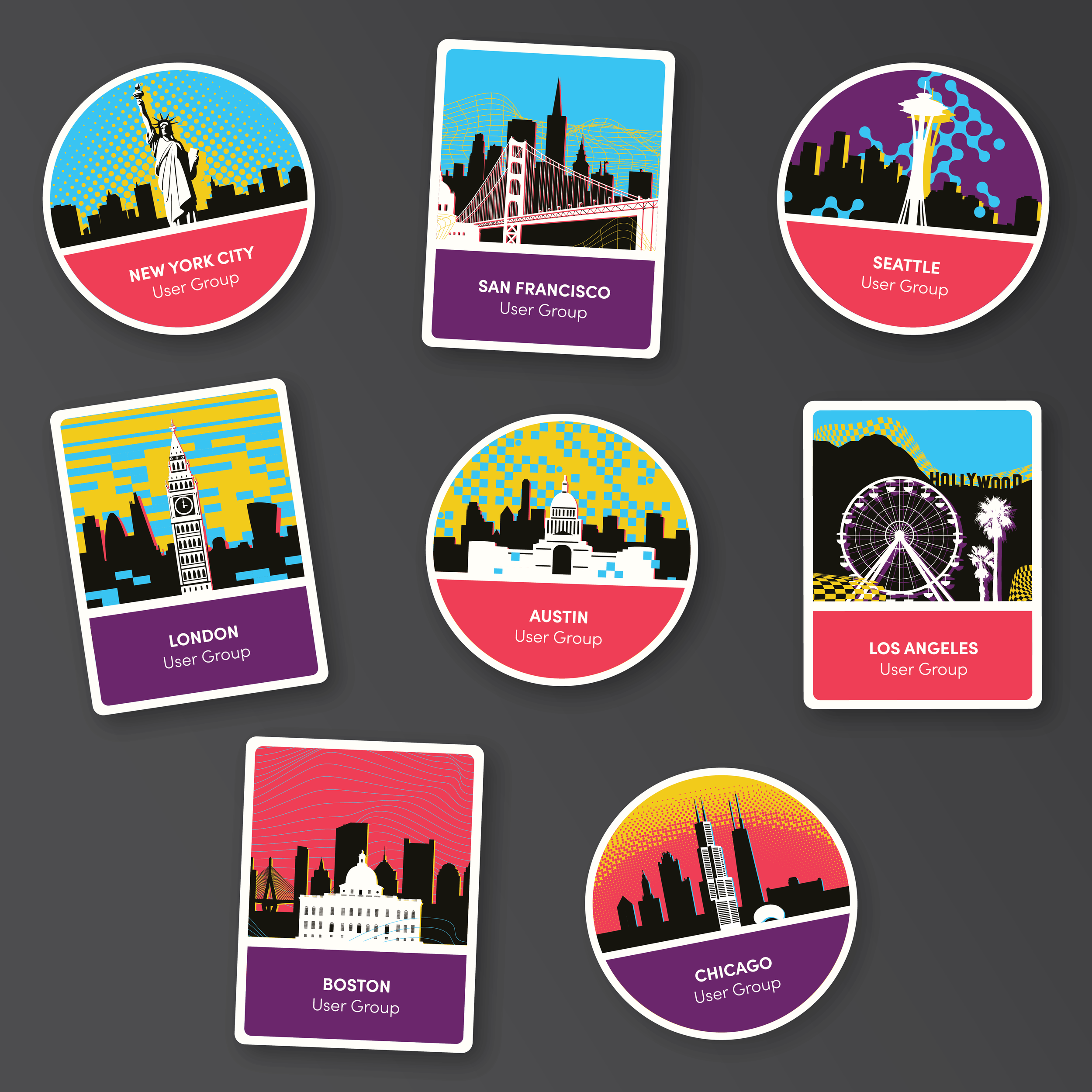 Event Sticker Design I designed these stickers for Iterable’s User Group program that takes place in these various cities.